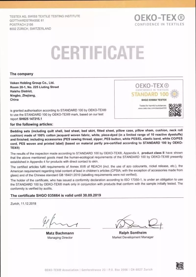 根據(jù)TESTEX瑞士紡織檢定有限公司檢測報告test report SH025 147215.1,維科控股集團股份有限公司已獲得STANDARD 100 by OEKO-TEX所述之授權(quán),使用OEKO-TEX標(biāo)簽。